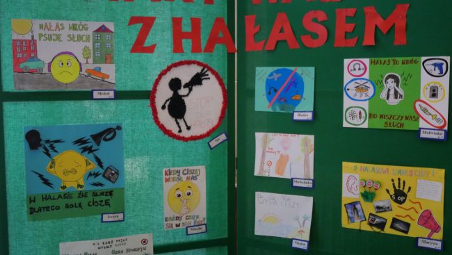 W ramach Dnia świadomości zagrożenia hałasem nauczyciele wspólnie z dziećmi wykonali plakaty, które zostały wyeksponowane w holu przedszkola dla rodziców