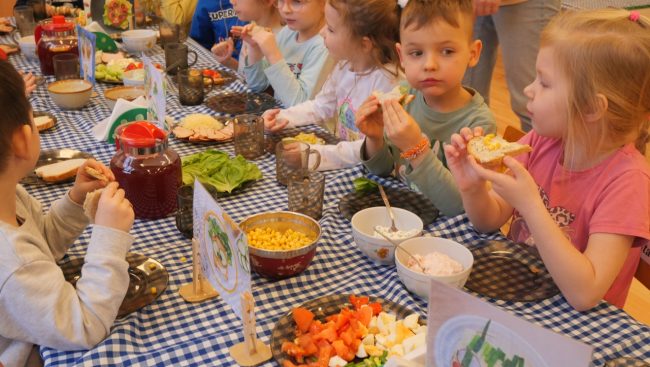 Smaczne, zdrowe, kolorowe – to kanapki przygotowane dziś przez naszych przedszkolaków. Najwięcej radości jest w samodzielnym przygotowaniu produktów i kolorowych past z sera, brokułów, pomidorów i rzodkiewki. Owocowe szaszłyki też pięknie wyglądają – a jakie smaczne.